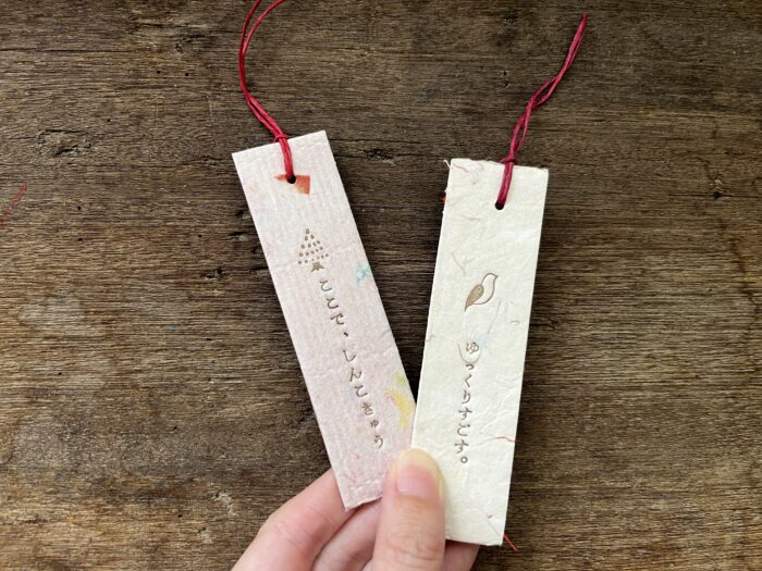 お好きな言葉を活版印刷した、手漉き紙のミニ栞を1枚作れます。